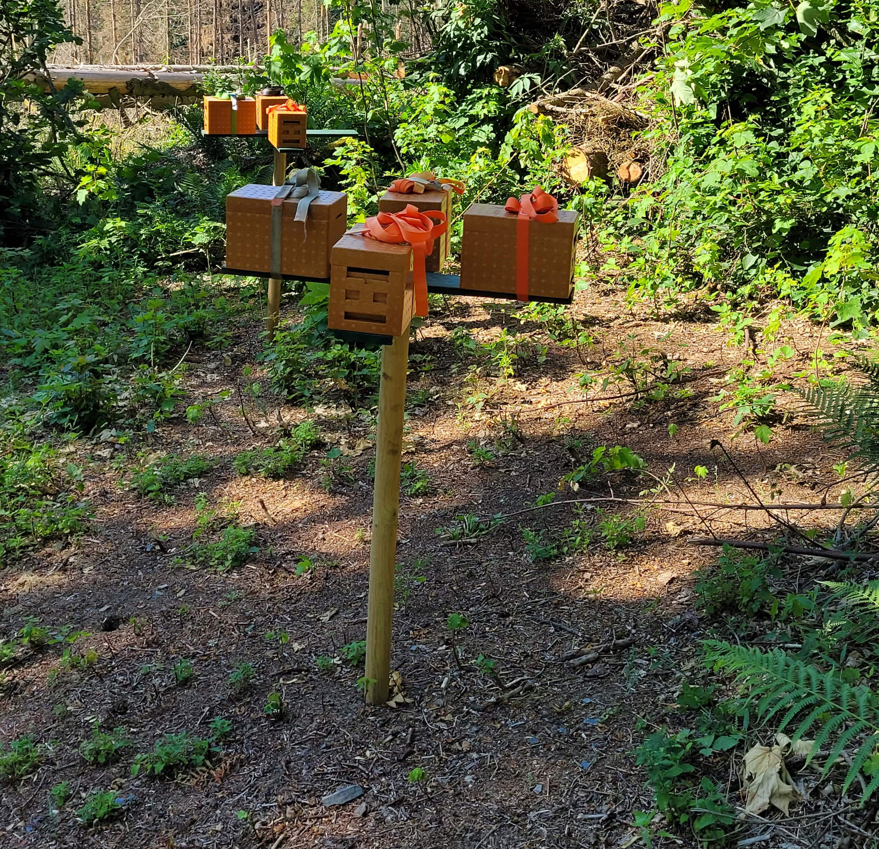 Am Lehrbienenstand des Imkervereins werden diese kleinen Bienenkästen, sogenannte Begattungskästchen, im späten Frühjar bis in den Sommer hinein zur Königinnenzucht aufgestellt.